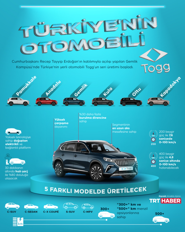 Cumhurbaşkanı Recep Tayyip Erdoğan tarafından 27 Aralık 2019'da ön gösterim araçlarının tanıtımı yapılan, 18 Temmuz 2020'de fabrikasının inşasına başlanan Togg'un seri üretimi için geri sayım sona erdi.