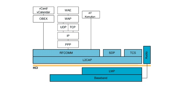 Bluetooth'un fonksiyonel olarak üç tane çekirdek protokolü vardır. Bunlar mantıksal link ve bağdaştırma protokolü (L2CAP - Logical Link Layer and Adaptation Protocol), Servis Keşif Protokolü (SDP - Service Discovery Protocol) ve Radyo Frekansı Haberleşme Protokolü (RFCOMM - Radio Frequency Communication). L2CAP, üst seviye protokol katmanlarını basebanda adapte eder.