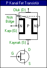 Yandaki grafikte görüldüğü gibi n kanal jfet transistörler iki adet P ve bir adette N maddesinin birleşiminden meydana gelmiştir. Fetin gate ucuna uygulanan gerilim ile D ve S ucları arasındaki direnç değeri kontrol edilir. Gate ucu 0V tutulduğunda, yani S ucuna birleştirildiğinde P ve N maddeleri arasındaki nötr bölge genişlemeye başlar. Bu durumda D ve S ucları arasından yüksek bir akım akmaktadır.