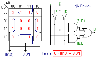 Yan tarafta karno haritası, tanımı ve lojik devresi görülmektedir. Lojik devre tasarlanırken ilk önce değişkenler ve değilleri hazırlanır. Daha sonra çarpımlar yani Ve kapıları yerlerine konur. En son olarakta toplamlar yani Veya kapıları yerlerine konur. Bu lojik devre en sade haldeki tanımdan oluşturulmuştur. Eğer tam sadeleştirilmemiş bir tanımdan lojik devre tasarlanırsa gereksiz fazlalıkta lojik kapı kullanılmış olur. Bu da gereksiz yere masraftır.