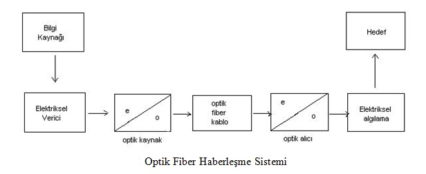 Bilgi kaynağı, optik haberleşme sistemine elektriksel işareti sağlar elektriksel verici optik kaynağı sürer. Optik kaynak taşıyıcı ışık kaynağının modülasyonunu yapar. (Elektrikten optiğe dönüşüm e/o). Optik fiber kablo taşıyıcı ortam olarak kullanılır. Optik alıcı (Fotodiyot ve tottransistör) demodülasyon yapar.(optikten elektriğe dönüşüm o/e). Daha sonra elektriksel algılama yapılarak hedefe gönderilir.