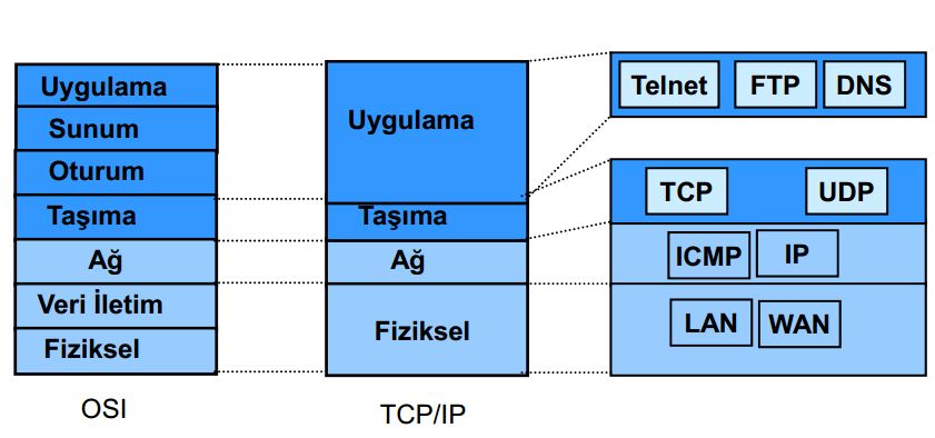 Taşıma katmanı: Bu katmanda verinin nasıl gönderileceği belirlenir. Veri güvenliği, hata kontrolü gibi işlemler yapılır. TCP ve UDP bu katmandadır. TCP klasik veri aktarımında UDP ise medya aktarımında kullanılır. TCP, UDP ye göre daha güvenli fakat daha yavaş çalışır. Çünkü TCP 'de gönderilen her veri paketinin ardından verinin yerine doğru bir şekilde ulaşıp ulaşmadığı kontrol edilir.